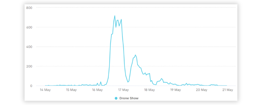 Έκρηξη δημοσιότητας καταγράφηκε στις 16 Μαΐου 2025, μια ημέρα μετά το drone show. Ο όγκος ξεπερνούσε τις 600 αναφορές την ώρα, ενώ το buzz παρέμεινε αρκετά υψηλό έως τις 18 Μαΐου, δείχνοντας την ένταση και τη διάρκεια της αντίδρασης στο online περιβάλλον.
