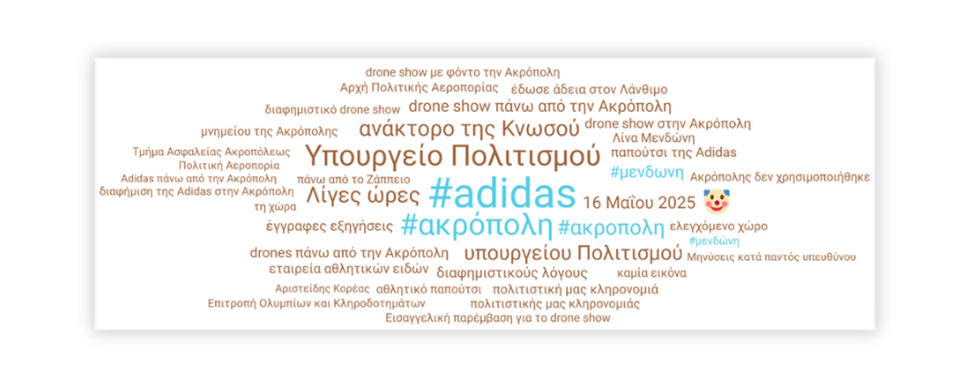 Στο word cloud εμφανίζονται επανειλημμένα φράσεις, όπως «μηνύσεις κατά παντός υπευθύνου», «εισαγγελική παρέμβαση», «έγγραφες εξηγήσεις», «παπούτσι της Adidas», ενώ στα top hashtags ξεχωρίζουν τα #adidas, #ακρόπολη και #μενδώνη. Ιδιαίτερο ενδιαφέρον παρουσιάζουν διάφορά emojis, με κυρίαρχα το 🤡, υποδεικνύοντας την ειρωνεία, την κριτική στάση και τη συναισθηματική φόρτιση των χρηστών.