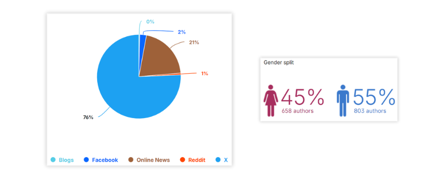Από τις πηγές δημοσιότητας που επελέγησαν προς ανάλυση, το 76% των αναφορών προήλθε από το X (πρώην Twitter), 21% από ενημερωτικές ιστοσελίδες (websites), 2% από το Facebook, 1% από το Reddit και λιγότερο από 1% από blogs. Πιο αναλυτικά για Twitter, το 55% των χρηστών ήταν άνδρες και το 45% γυναίκες, ένδειξη ευρείας δημογραφικής συμμετοχής στη συζήτηση.