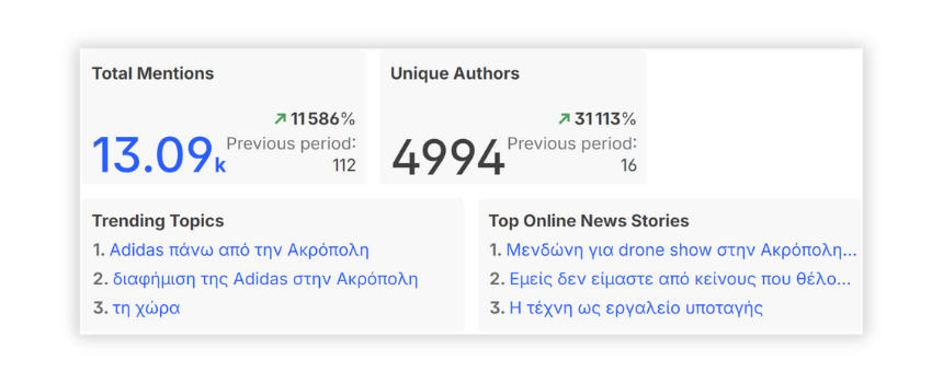 Πώς ένα drone show της Adidas κοντά στην Ακρόπολη προκάλεσε χιλιάδες αντιδράσεις μέσα σε λίγες ώρες; Η ομάδα της Clip News αξιοποιεί την πλατφόρμα Brandwatch και παρουσιάζει μια ανάλυση digital listening. Από τα κορυφαία hashtags μέχρι το συνολικό sentiment, αυτό το case study δείχνει πώς η αποδελτίωση νέας γενιάς μετατρέπεται σε εργαλείο επικοινωνιακής στρατηγικής.