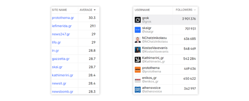 Τα websites με τη μεγαλύτερη επιρροή βάσει του δείκτη Impact* είναι τα “protothema.gr”, “iefimerida.gr”, “news247.gr”. Από πλευράς X λογαριασμών, οι “grok” και “skaigr”, καθώς οι δημοσιογράφοι “NChatzinikolaou” και “KostasVaxevanis”, είχαν τη μεγαλύτερη απήχηση βάσει του αριθμού Followers, ενισχύοντας τη διάχυση της είδησης.