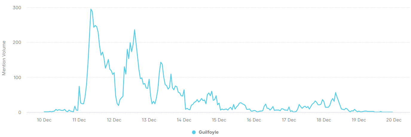 Η δημοσιότητα για την Kimberly Guilfoyle παρουσίασε σημαντικές διακυμάνσεις, με το υψηλότερο peak αναφορών να εμφανίζεται στις 11 Δεκεμβρίου. Από την ανάλυση προέκυψαν τα εξής: