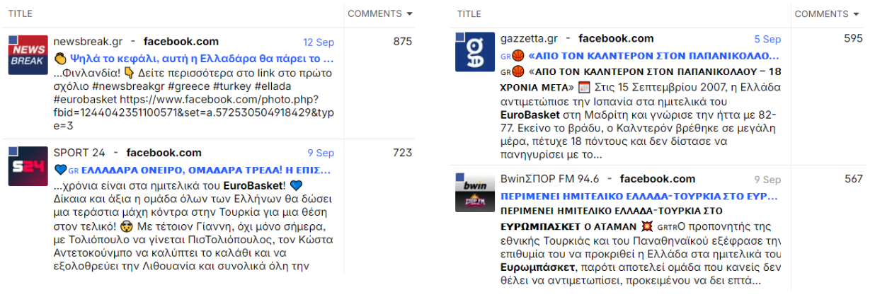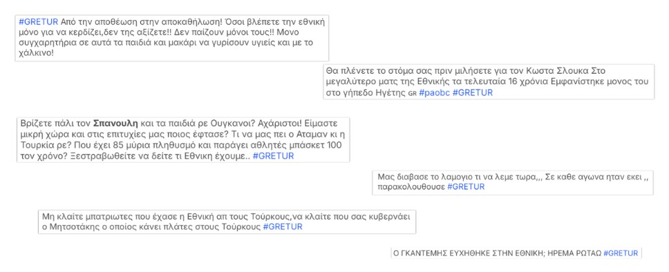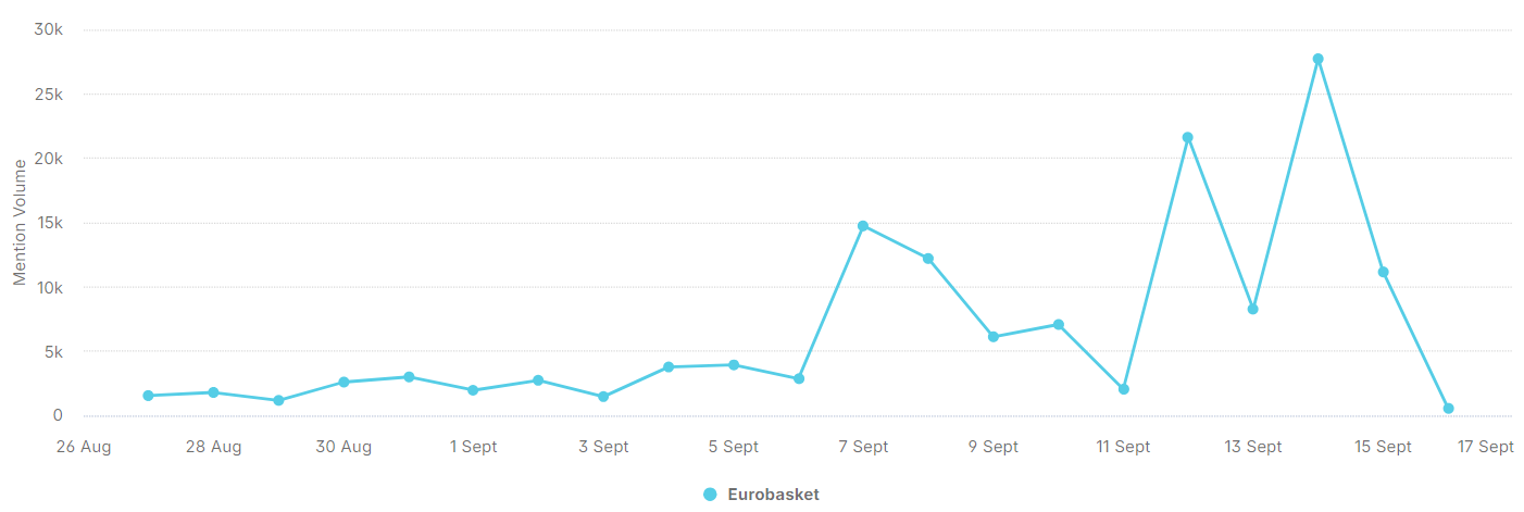 *Η ανάλυση βασίζεται μόνο σε διαθέσιμα δημόσια δεδομένα από κανάλια social media στην Ελλάδα. Η αναζήτηση περιορίστηκε στα keywords «Eurobasket» και «Εθνική Μπάσκετ» σε όλες τις πιθανές παραλλαγές (αγγλικά, ελληνικά, greeklish, με ή χωρίς τόνους, κτλ) και στα hashtags των αγώνων της Εθνικής Ομάδας μας (π.χ. #grefin, #gretur, #greisr).
