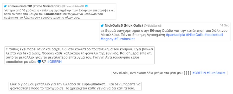 - Emojis: 🏀👏🇬🇷❤️, που εκφράζουν ενθουσιασμό και εθνική υπερηφάνεια