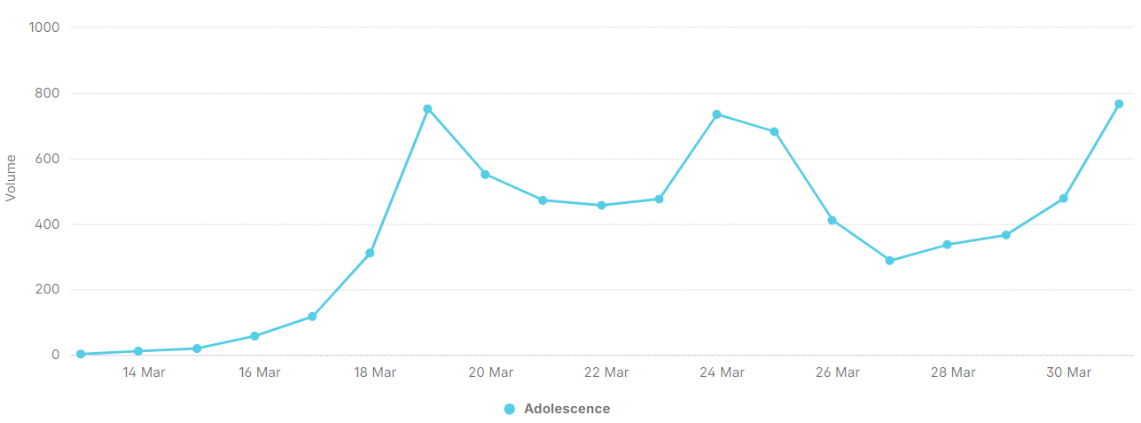 Το γράφημα με τις ημερήσιες αναφορές δείχνει τρεις βασικές κορυφώσεις: 19 Μαρτίου, 24 Μαρτίου και 31 Μαρτίου. Η πρώτη κορύφωση φαίνεται να συνδέεται με την πρεμιέρα της σειράς Adolescence, ενώ η δεύτερη με την ευρεία συζήτηση που ακολούθησε στα social media. Η τρίτη σχετίζεται περισσότερο με τη δημόσια συζήτηση για την προβολή της σειράς στα σχολεία, όπως αναμένεται ότι θα συμβεί στη Βρετανία.