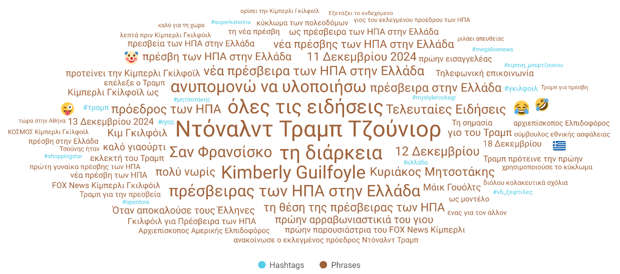 Το ενδιαφέρον των χρηστών είναι υψηλό, και αυτό φαίνεται από τη μεγάλη ποικιλία θεμάτων και όρων που συγκεντρώνει το θέμα. Το hashtag #blackfriday κυριαρχεί με μεγάλη διαφορά, δείχνοντας ότι αποτελεί τον βασικό τρόπο με τον οποίο οι χρήστες συμμετέχουν στις συζητήσεις. Άλλα σχετικά hashtags, όπως #sales και #black_friday, υποστηρίζουν τη γενική συζήτηση. Hashtags όπως #kotsovolos, #adidas, #plaisio φανερώνουν τον προσανατολισμό των χρηστών προς συγκεκριμένες μάρκες και προϊόντα. Οι φράσεις “μπλακ φραιντεϊ” και “Black Friday λες” φέρνουν έναν πιο προσωπικό και συχνά χιουμοριστικό τόνο στη συζήτηση. Παρατηρούνται επίσης φράσεις, όπως “μετρο_θεσσαλονικης” και “λευκή νύχτα”, υποδηλώνοντας τοπικά γεγονότα και trends που έχουν επηρεάσει τη συζήτηση. Μεταξύ άλλων εμφανίζεται και η “Cyber Monday”, δείχνοντας τη σύνδεση των δύο εμπορικών γεγονότων. Τα ειρωνικά emojis 🤡 🤣 😂 δεν απουσιάζουν φυσικά, ενισχύοντας τα σχόλια που ακούν αυστηρή κριτική στο ύψος των προσφορών.
