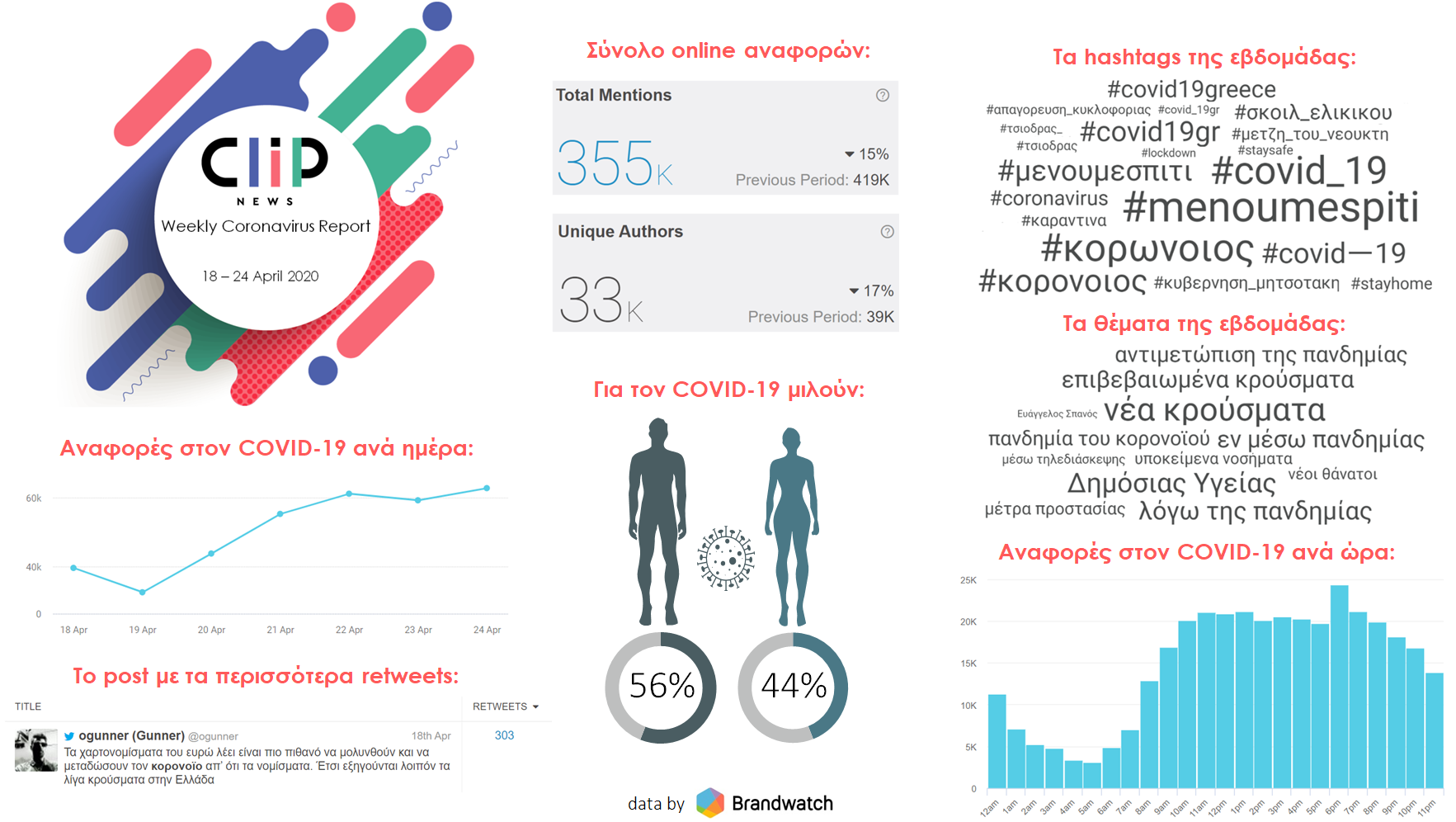 Η Clip News, εταιρεία υπηρεσιών Αποδελτίωσης, Reporting & Analysis, παρουσιάζει τις σημαντικότερες τάσεις του διαδικτύου σχετικά με τον COVID-19 για το χρονικό διάστημα 18-24/04. Η συλλογή και η ανάλυση των online δεδομένων πραγματοποιήθηκε μέσω της πλατφόρμας Brandwatch*.