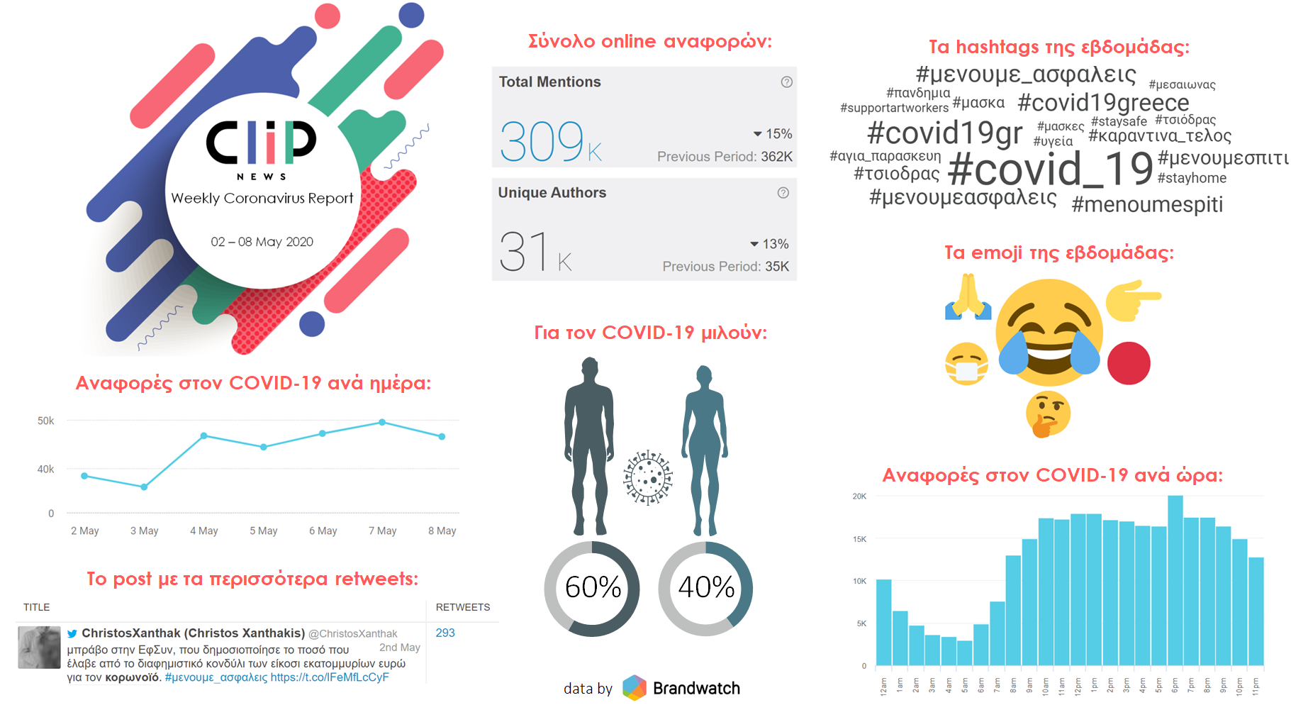 Η Clip News, εταιρεία υπηρεσιών Αποδελτίωσης, Reporting & Analysis, παρουσιάζει τις σημαντικότερες τάσεις του διαδικτύου σχετικά με τον COVID-19 για το χρονικό διάστημα 02-08/05. Η συλλογή και η ανάλυση των online δεδομένων πραγματοποιήθηκε μέσω της πλατφόρμας Brandwatch*.